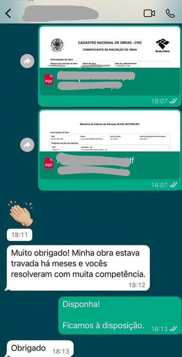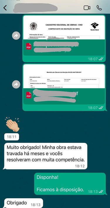 Nosso compromisso é descomplicar o processo burocrático para que você possa focar no que realmente importa: a sua construção. Atuamos com seriedade, agilidade e transparência, cuidando de cada etapa até a emissão do CNO e da CND, documentos essenciais para comprovar a regularidade da obra.